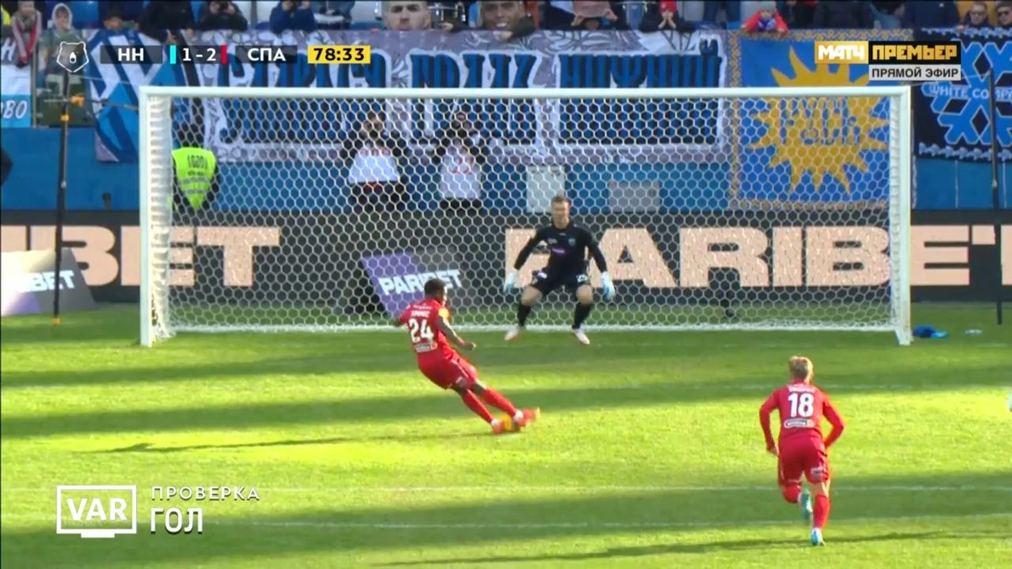 История из мартовского матча с «Пари НН». Тогда сначала арбитр Сергей Иванов засчитал гол, потом по подсказке ВАР посмотрел повтор. Выяснилось, что после удара правой мяч попал в левую Квинси и только потом отскочил в ворота.