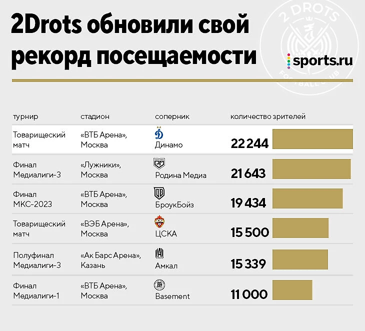 «ВТБ Арена» вмещает 25 700 зрителей. Матч с 2Drots собрал больше, чем любая игра на этом стадионе не только в этом сезоне, а за весь 2023 год. Ближе всего к рекордной планке арены подобрался матч сборной России с Камеруном – 20 152 болельщика. На ЦСКА (в РПЛ) и «Спартак» (в Кубке) ходили почти одинаково, но хуже.
