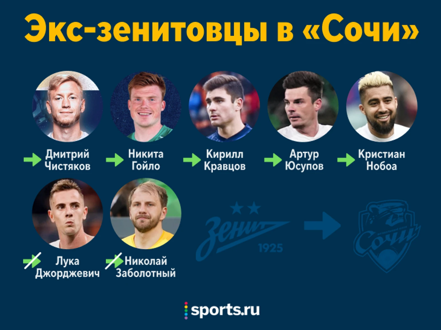 С зенитовским прошлым Лука Джорджевич и Николай Заболотный – но это не прямые переходы. Есть слухи про сочинские варианты у Ерохина и Сутормина – с ними будет еще больше похоже на период избавления «Зенита» от лишних игроков, когда их засылали в «Сочи» пачками.