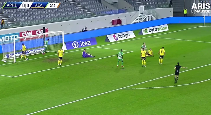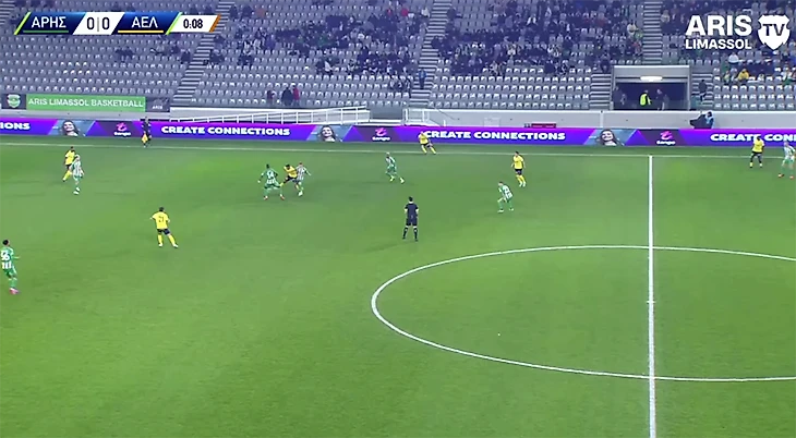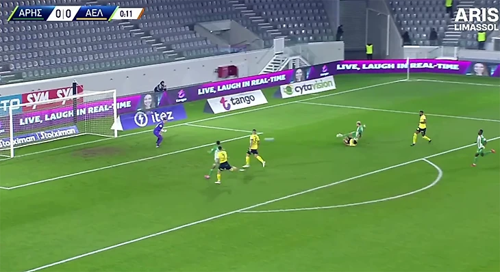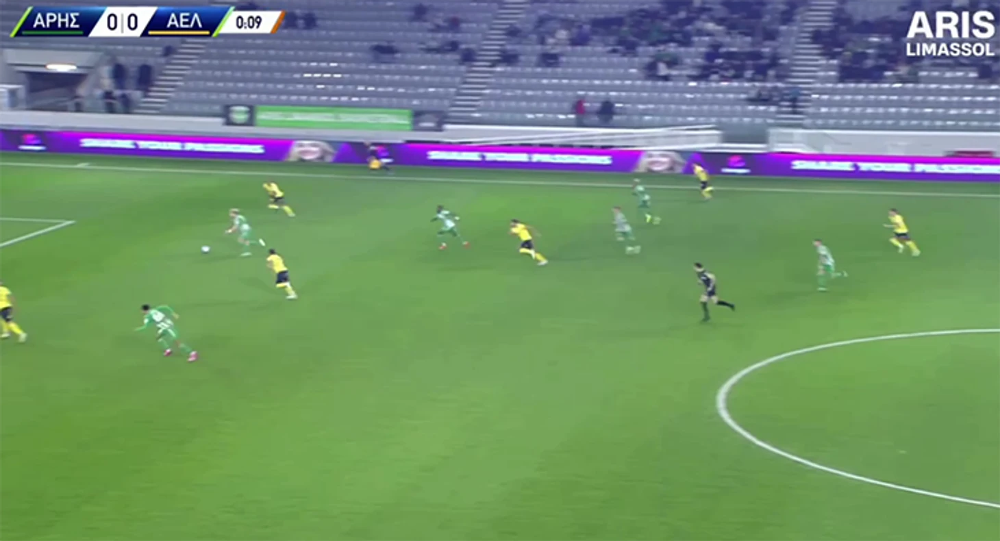 Разберем покадрово. На восьмой секунде партнеры Александра по «Арису» окружили соперника из АЕЛ и отобрали мяч.