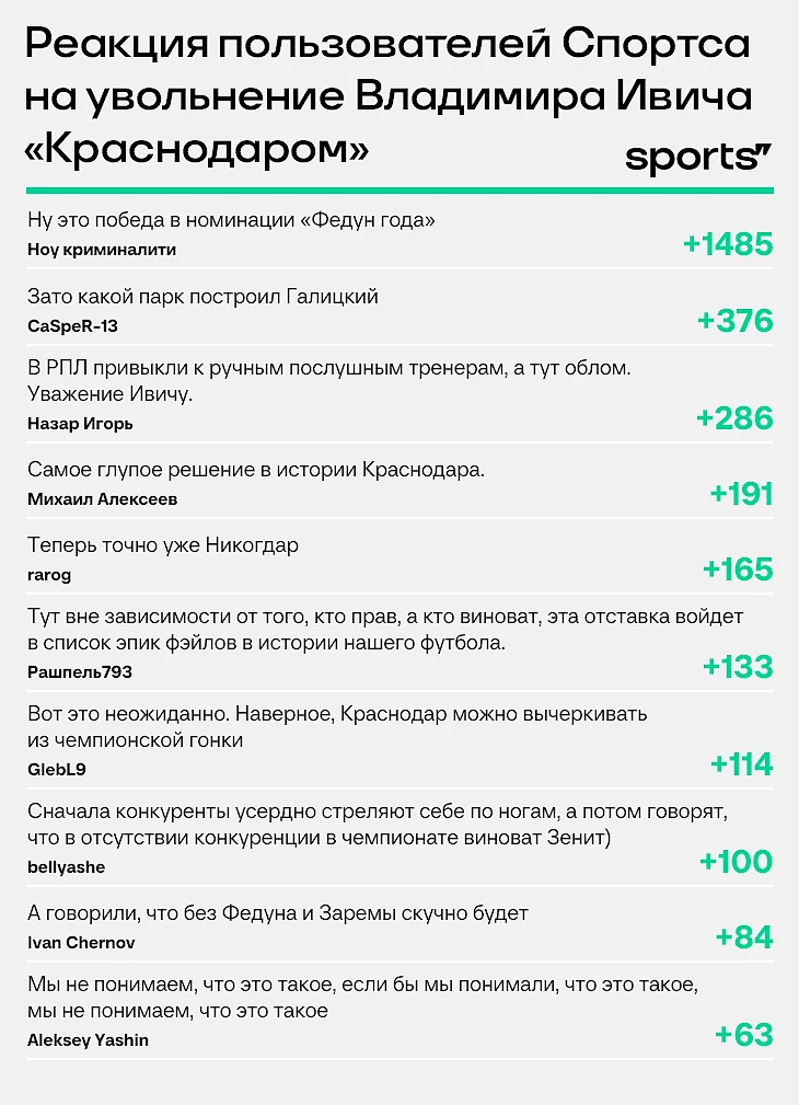 Увольнение Владимира Ивича в разгар чемпионской гонки вызвало волну негодования среди болельщиков. В нашем опросе 85% пользователей ответило, что не понимает «Краснодар».
