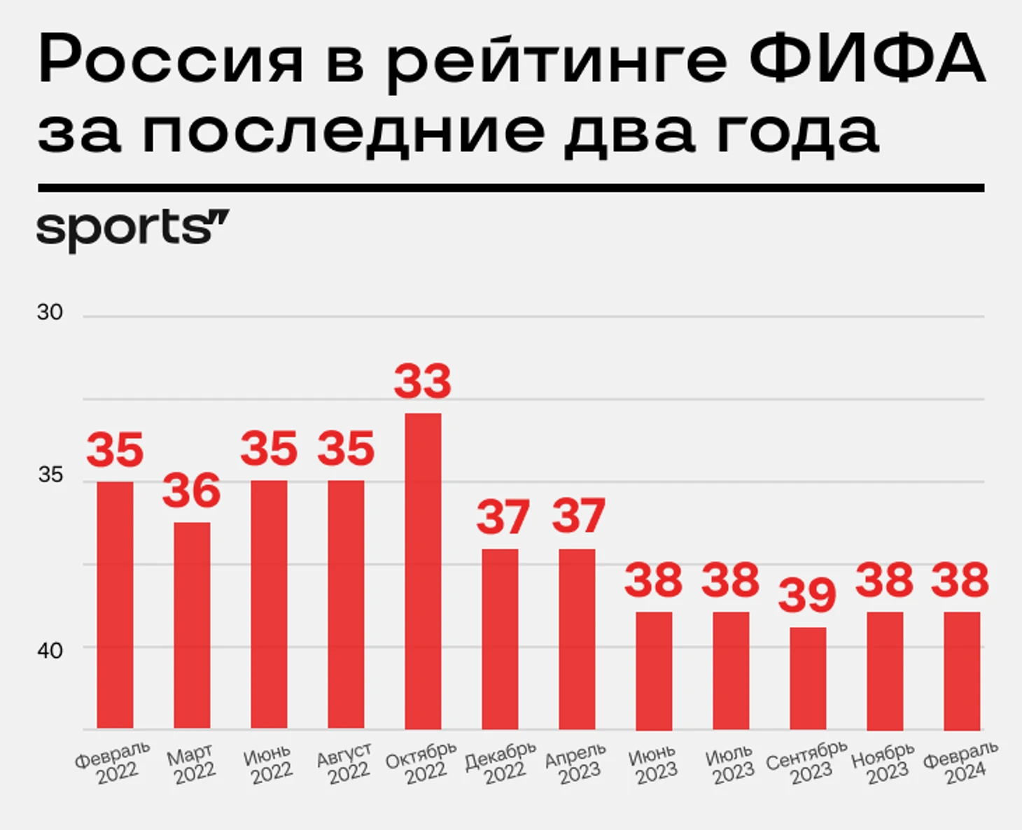 За последние два года позиция Россия менялась незначительно. Изменения были в пределах четырех мест, только в октябре 2022-го удалось переместиться на 33-е, когда обыграли Кыргызстан. В том же году ничьи с Таджикистаном и Узбекистаном подвинули ниже.