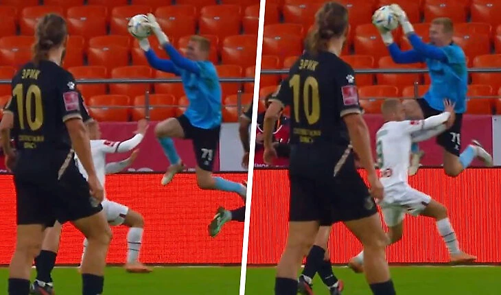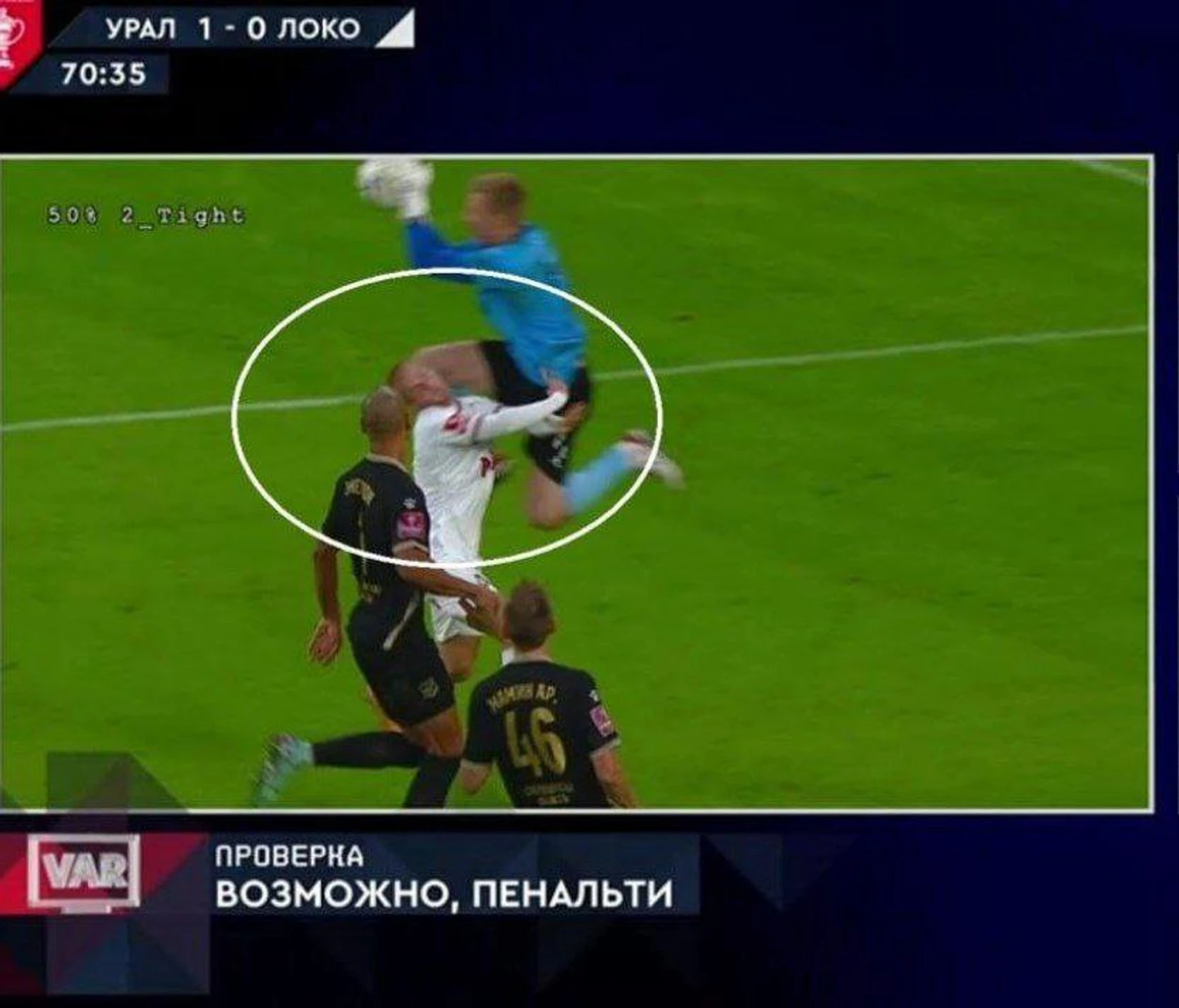 Судья Левников счел эпизод игровым, ведь вратарь поймал мяч до столкновения и летел уже по инерции. Однако у арбитра на ВАР Виталия Мешкова другое мнение: он позвал коллегу к монитору.