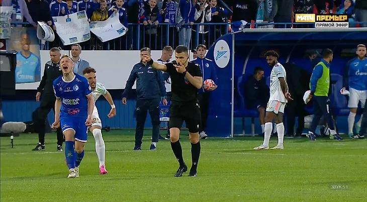 В следующей же атаке игроки «Факела» окружили судью Алексея Сухого: в штрафной «Зенита» мяч попал в руку Нуралы Алипа.