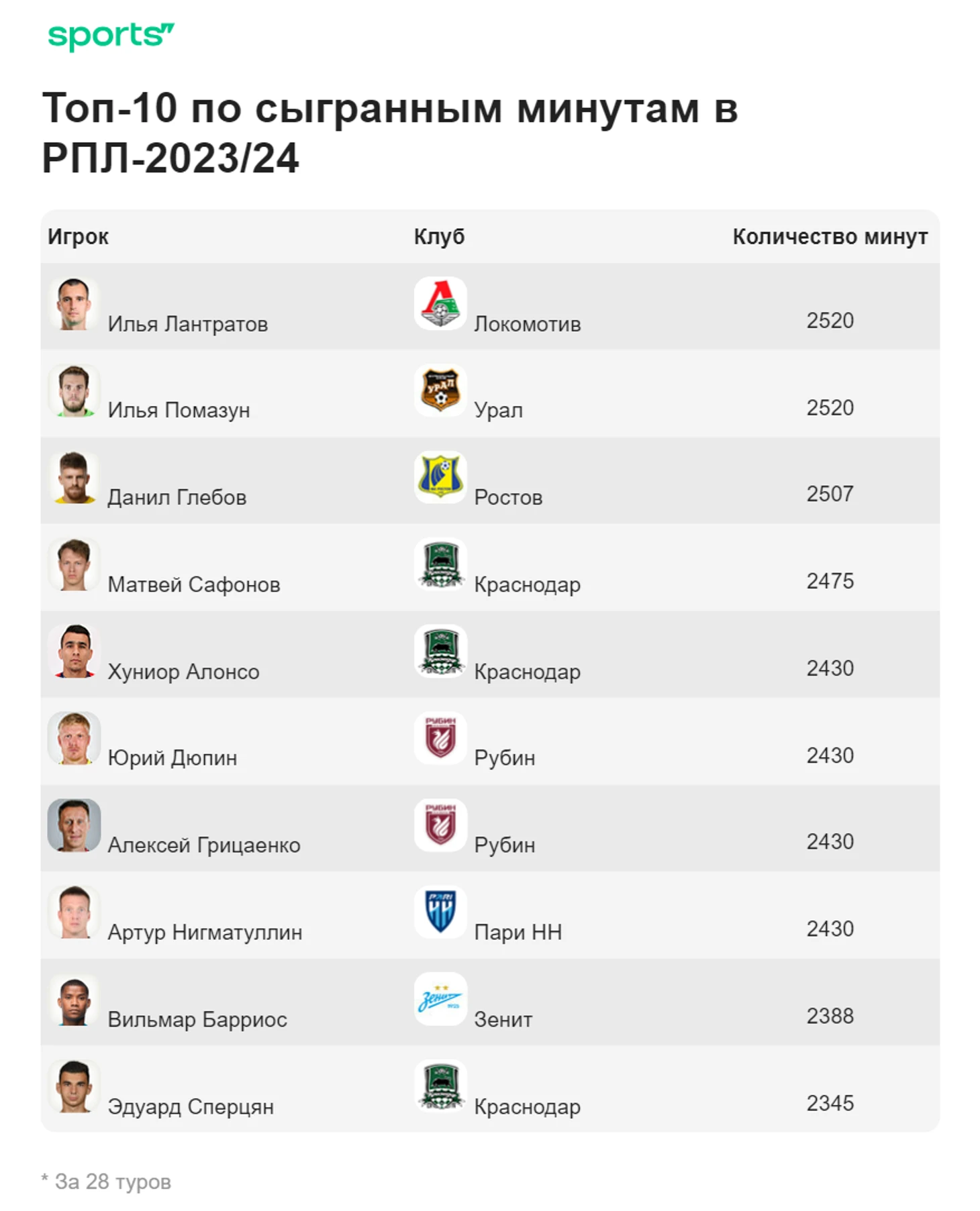 ● Также в списке нет среди представителей «Оренбурга», «Балтики» и «Сочи». У остальных 11 клубов в двадцатке есть хотя бы один футболист с 2218+ минутами.