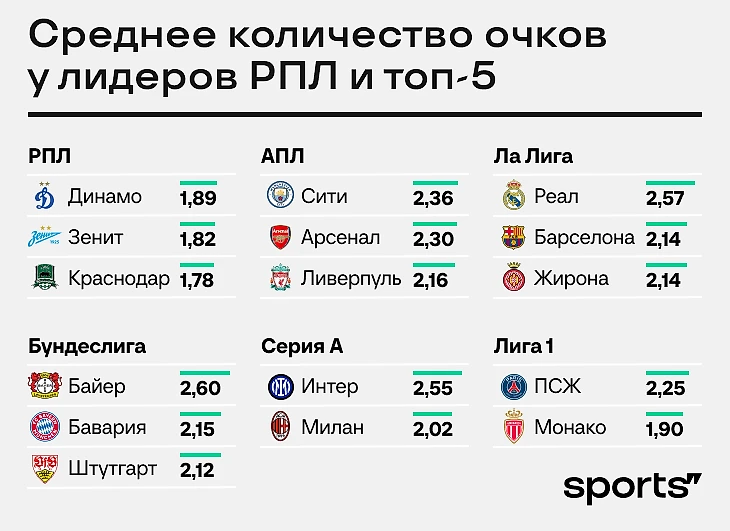«Зенит», «Краснодар» и «Динамо» в среднем не набирают даже двух очков за матч. В топ-лигах все по-другому.