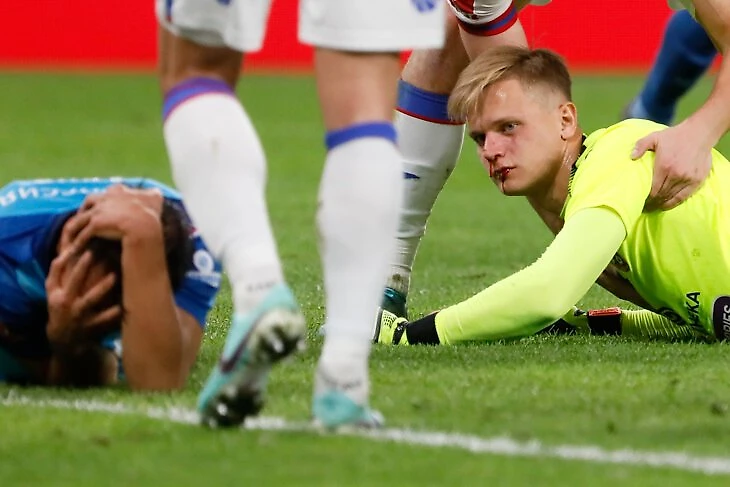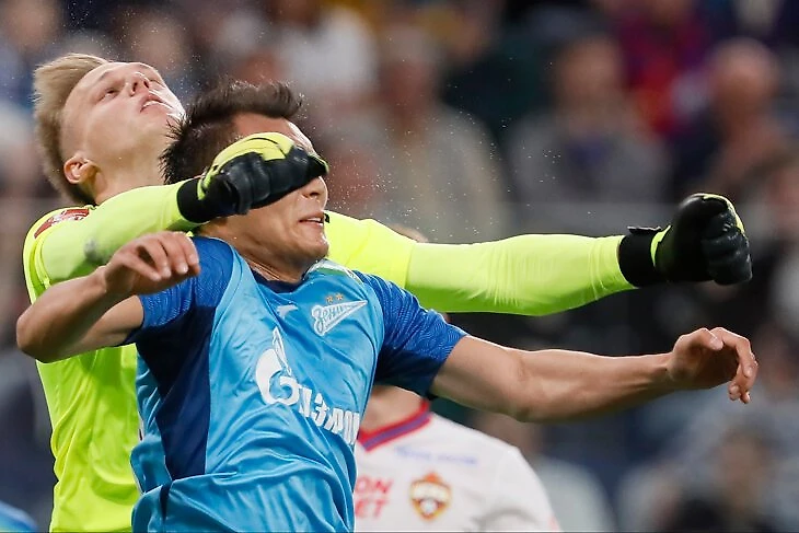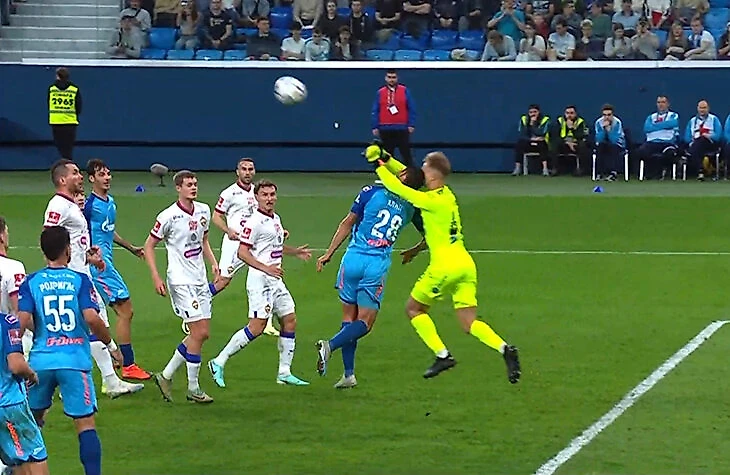 Он играл на выходе при штрафном «Зенита», на мяч еще шел защитник Нуралы Алип – столкновение.