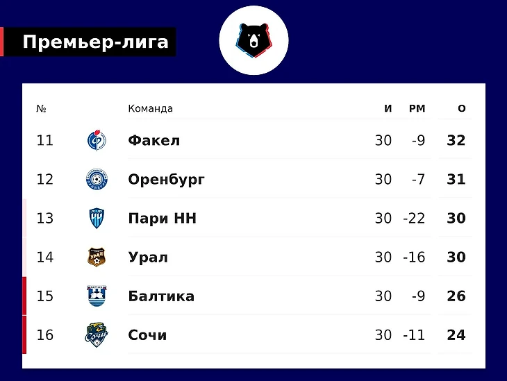 «Сочи» и «Балтика» вылетели из РПЛ – следующий сезон проведут в ФНЛ. «Пари НН» и «Уралу» предстоят стыки.