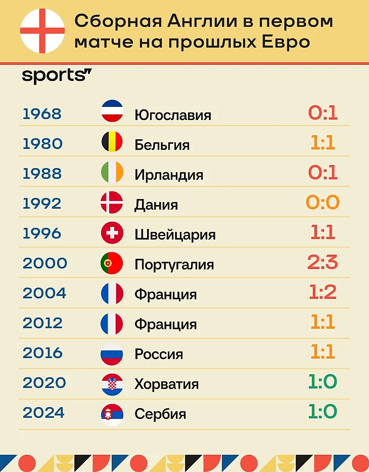 И только при Саутгейте Англия стала выигрывать первый матч Евро. Посмотрите, как было раньше: