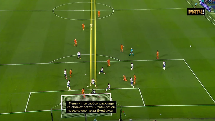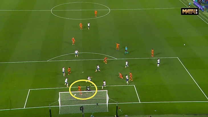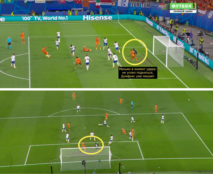 1. Обычно вратарь отталкивается перед прыжком – из-за Думфриса сделать шаг в сторону и упасть почти нереально. Только через движение назад, которое точно усугубило ситуацию. Здесь небольшое позиционное сомнение: нет уверенности, что Меньян успел бы переместиться при благоприятном раскладе.