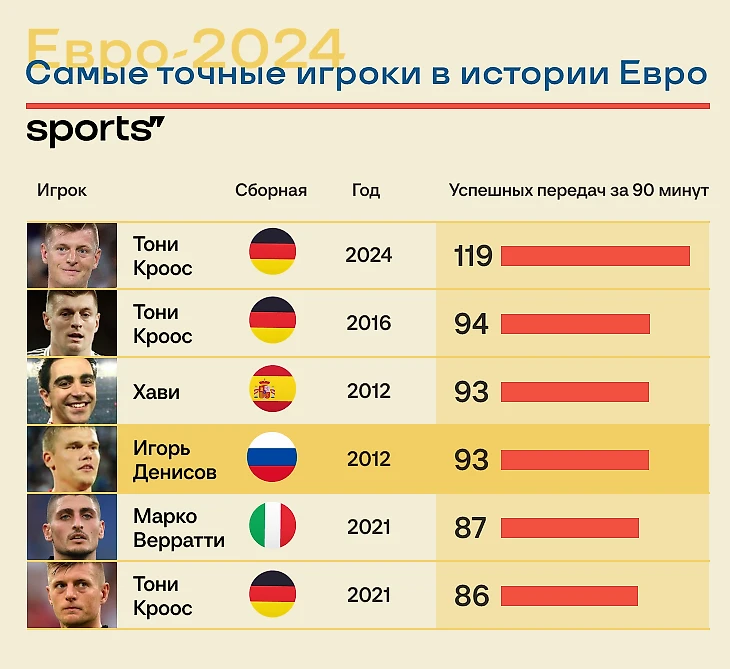 Кроос идет на рекорд по числу точных передач за 90 минут – Тони ездил на четыре чемпионата Европы (начал в 2012-м), на трех турнирах дает запредельный объем.