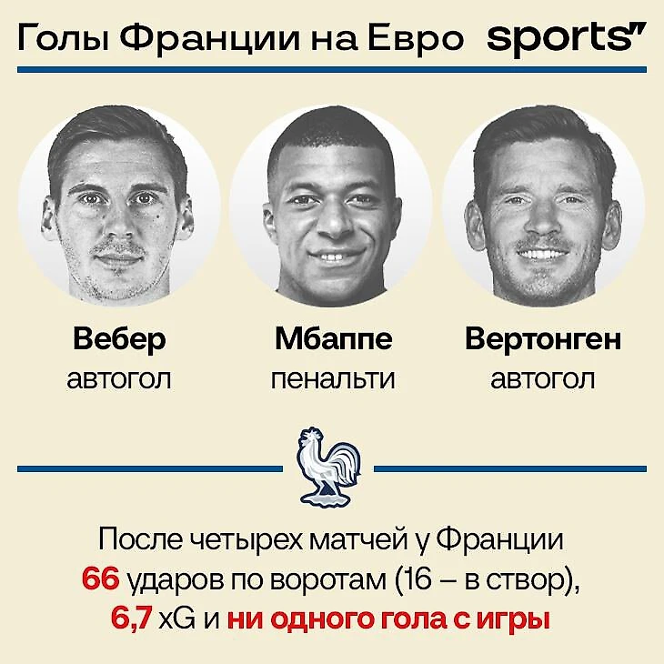 В третьем набрали очко, потому что Мбаппе реализовал пенальти. Для форварда это был первый в жизни мяч на чемпионатах Европы. Причем на Евро (в 2020-м и сейчас) он нанес перед этим 22 удара без голов.