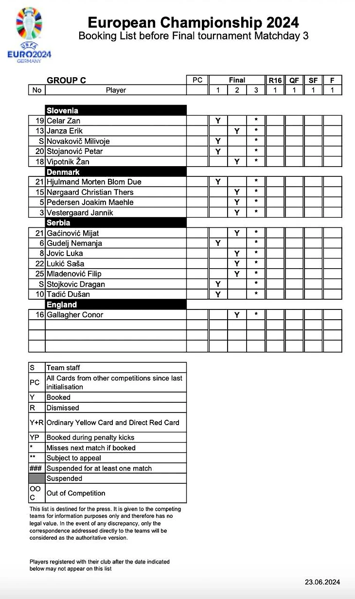 В дисциплинарном рейтинге сборных от УЕФА, который обновлялся по ходу игры, у словенцев было указано шесть карточек – то есть только игровые. 🆕 Днем в среду журналист Daily Telegraph Сэм Дин передал, что в УЕФА подтвердили: все решила карточка Миливойе Новаковича.
