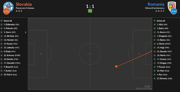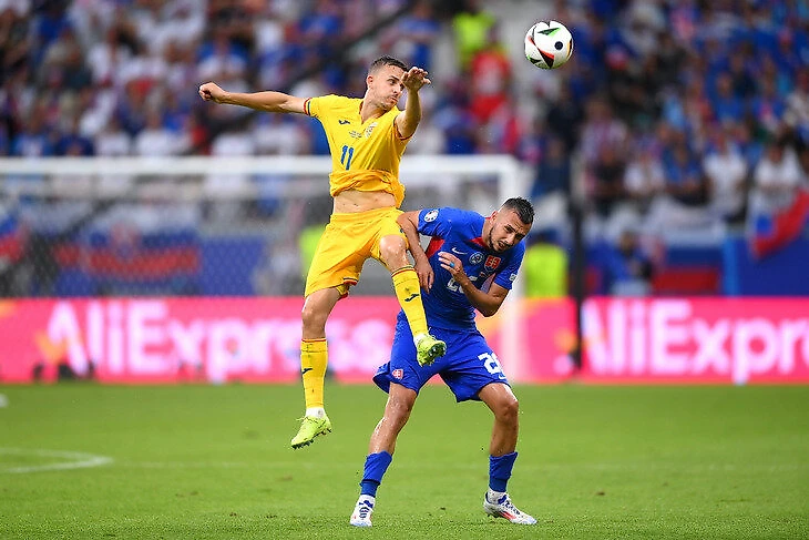 Так и было. Словаки опять перекрывали выходы из защиты. Румыния отвечала ситуативным прессингом. Кстати, пару раз крайне эффективно: атака, когда заработали пенальти, началась именно с высокого возврата.