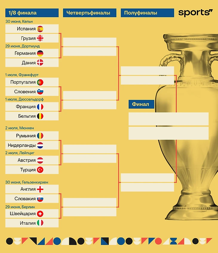 Завершился групповой этап чемпионата Европы-2024. Вот финальная сетка плей-офф.