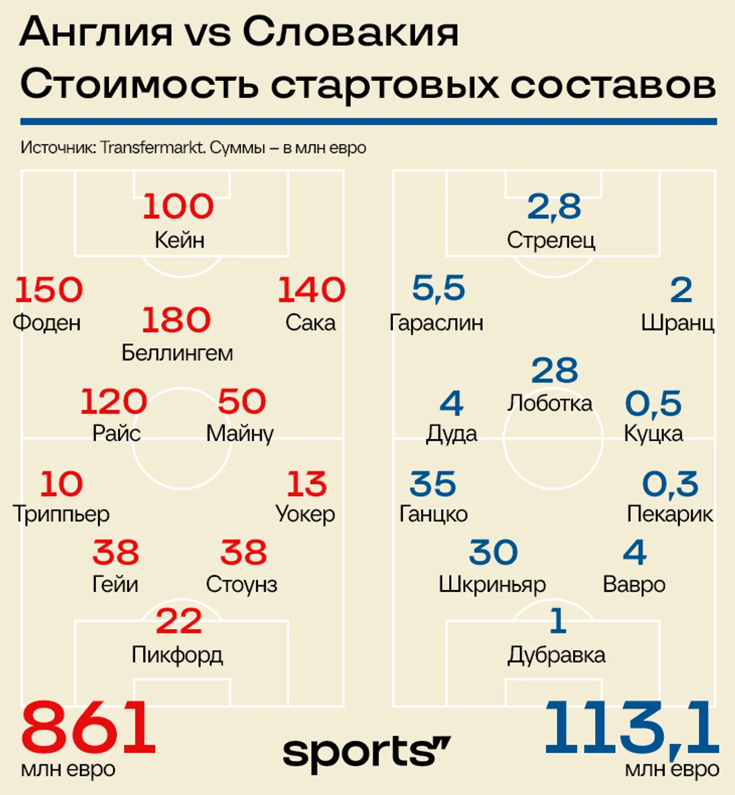 Кальцона явно готовился – цифры актуальные. Заявка англичан на Евро (по версии ТМ) оценена в 1,52 млрд евро. Словакия – в скромные 156 млн. Похожий разрыв и в стоимости игроков стартового состава.