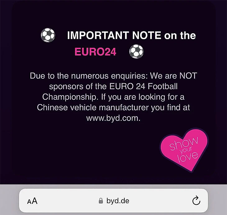 Перед началом Евро-2024 китайский производитель автомобилей BYD выкупил множество слотов, чтобы рекламу бренда крутили на каждом матче.