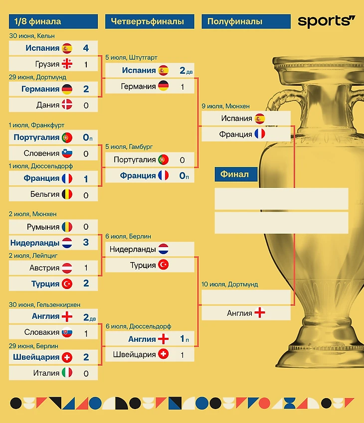 Это будет вторая игра 1/2 финала – в среду, 10 июля, в 22:00 мск. На стадионе «Боруссии» в Дортмунде. Покажет Okko.