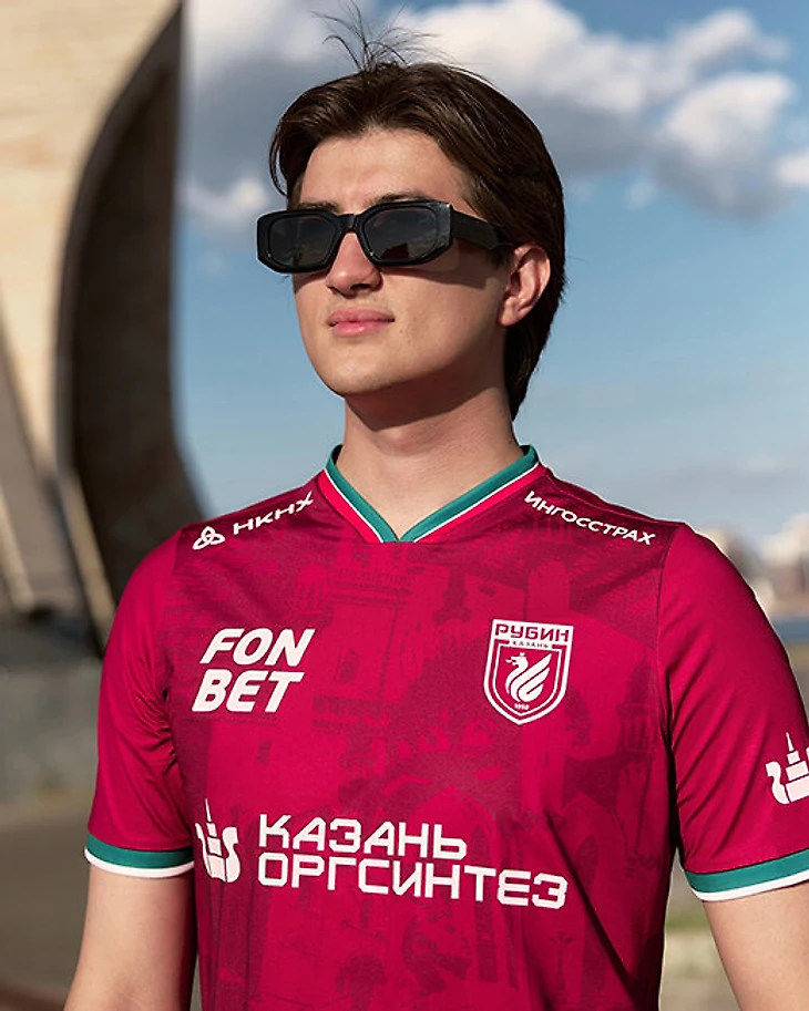 Рубиновый домашний комплект – признание в любви к родному краю. На футболке изображены известные достопримечательности Казани: Спасская башня Кремля, мечеть Кул Шариф, Благовещенский собор, памятник Мусе Джалилю, Чаша, Дворец земледельцев и стадион «Ак Барс Арена». Воротник окрашен в цвета флага Татарстана, а внутренняя часть содержит строчку из национального гимна: «Республикам минем, Татарстан!» («Моя республика, мой Татарстан)».