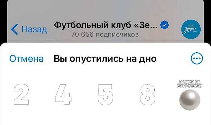 «Зенит» и тогда проверил показатели «маяковского счетчика» – выложил в телеграм-канал стикерпак с названием «Вы опустились на дно», в котором есть цифры 2, 4, 5 и 8, а также жемчужина.