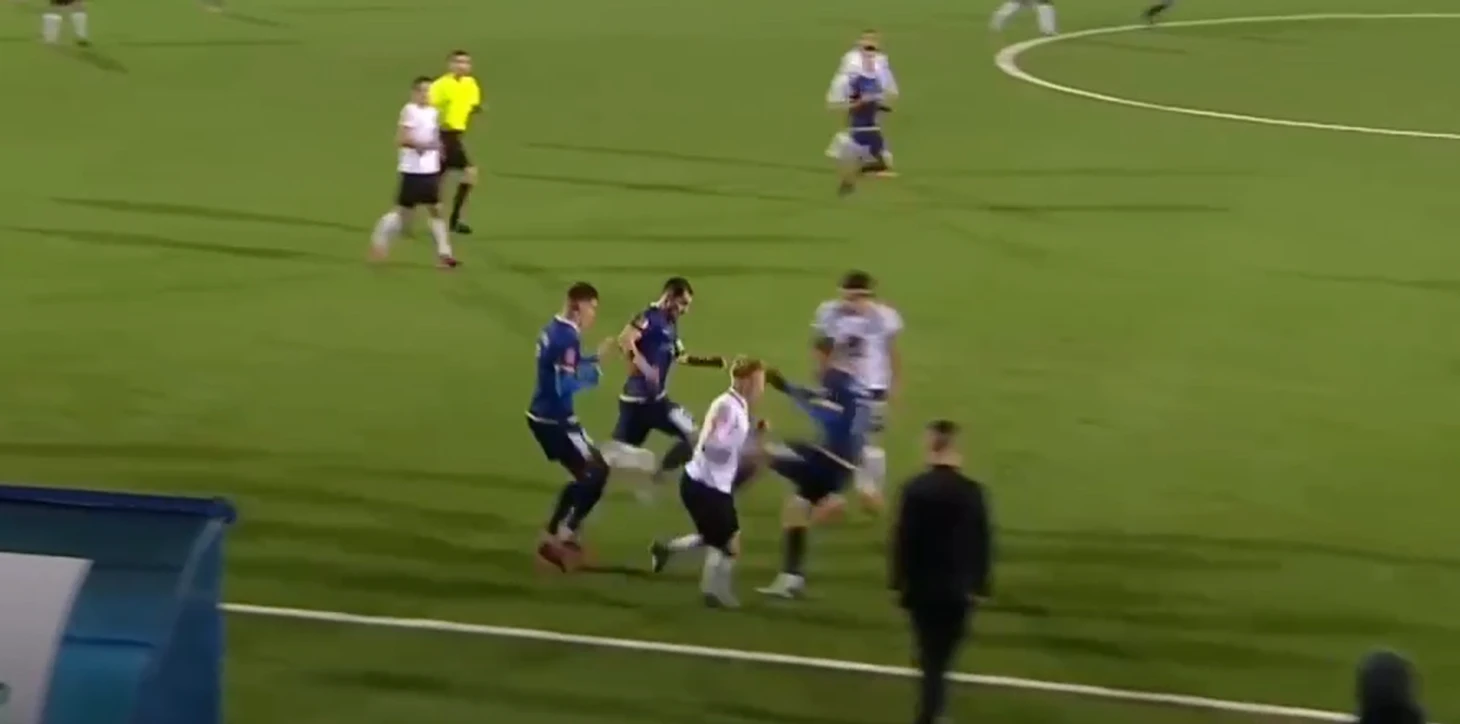 Капитан КАМАЗа Руслан Аюкин, выбивая мяч, врезался в футболиста «Торпедо» Юрия Коледина.
