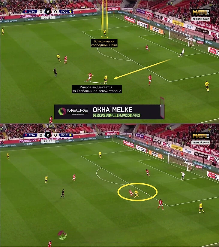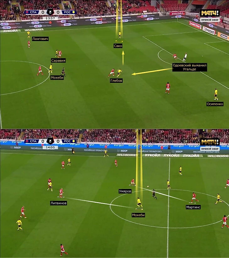 – лучшая траектория для прессинга Глебова. Перевод на Сако был очевиден, а Умяров как раз бежал левее;