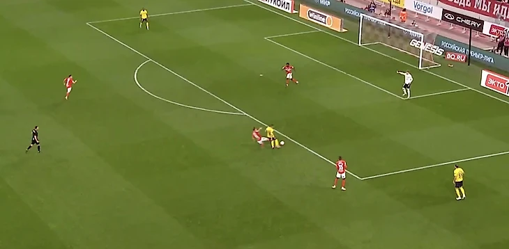 Здесь сразу два эффекта: Глебов вытащил Мартинса в глубину, оголив опорную зону, а Литвинов сел к защитникам, из-за чего перед Мохеби большое пространство. Он ворвался в штрафную и прострелил.