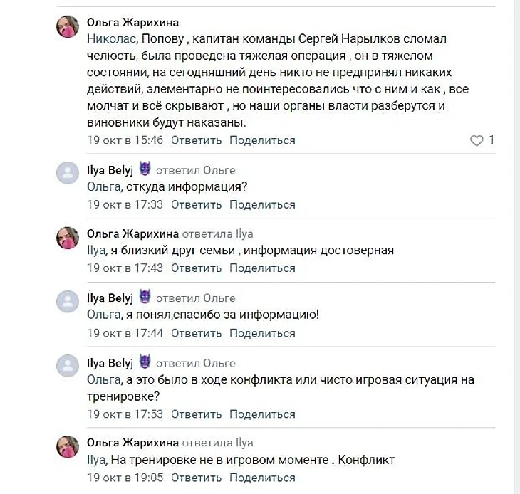 Подробности в соцсетях дала Ольга Жарихина, представившаяся близким другом семьи: «Он [Попов] в тяжелом состоянии. На сегодняшний день никто не предпринял никаких действий. Элементарно не поинтересовались, что с ним и как. Все молчат и все скрывают. Но наши органы власти разберутся и виновники будут наказаны». По данным Ольги, потасовка случилась не в игровом эпизоде, а из-за конфликта.
