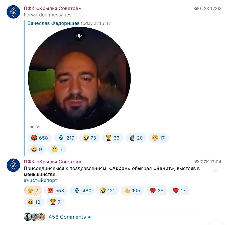 «Приветствую всех болельщиков «Крыльев Советов», – начал Солдатенков. – Хочется обратиться ко всем читателям этого телеграм-канала и напомнить вам о том, что в данном телеграм-канале должны публиковаться посты исключительно про «Крылья Советов». Вы можете себе представить ситуацию, если «Спартак» в своем телеграм-канале поздравит с победой ЦСКА. Я не могу. Думаю, что вы тоже. В завершении хотел бы еще раз сказать: это телеграм-канал «Крыльев Советов». Еще раз хочу обратиться к болельщикам: спасибо большое за поддержку, всего хорошего».