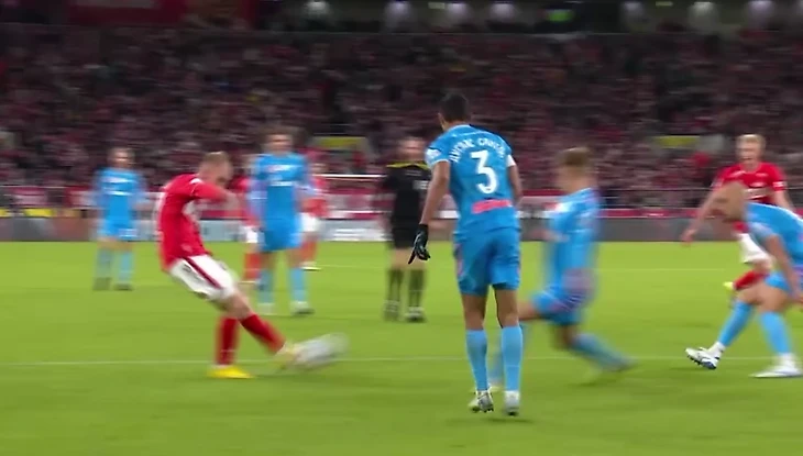 Соответственно, спор сводится к тому, какой момент правильно считать первой точкой касания для Денисова. Мы располагаем укрупнением от «Зенита», кадр ВАР-судей – только с общего плана. Насколько можно судить по такому сравнению, «Зенит» выставляет эту точку на долю секунды позже.