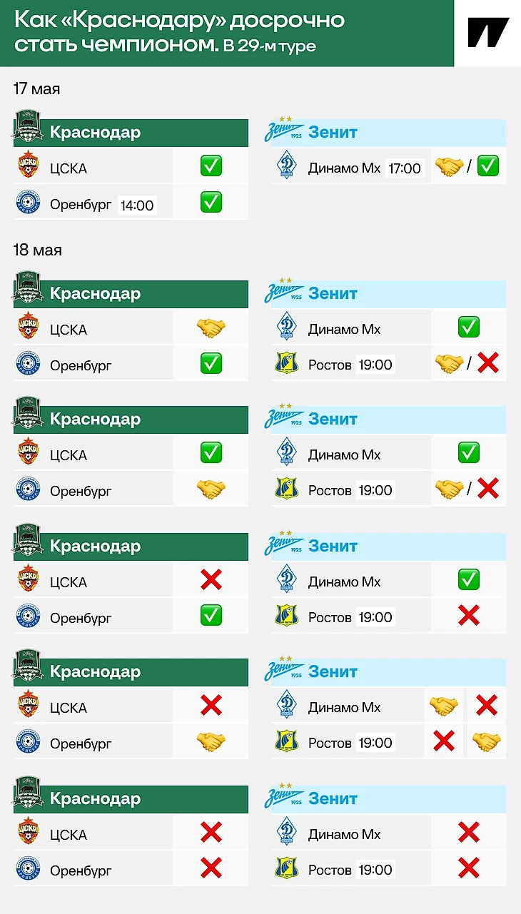 ● Две победы «Краснодара» над ЦСКА и «Оренбургом» (тоже на выезде) автоматически принесут титул. «Зенит» играет предпоследний тур на день позже краснодарцев, но если южане сами заберут шесть очков, игра петербуржцев с «Ростовом» уже ни на что не повлияет.