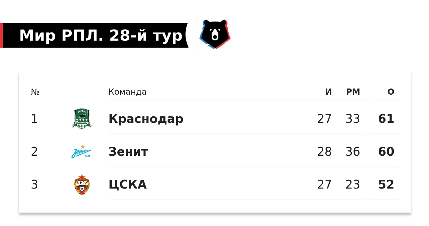 Расклад обновится после игры ЦСКА – «Краснодар». Ждем.