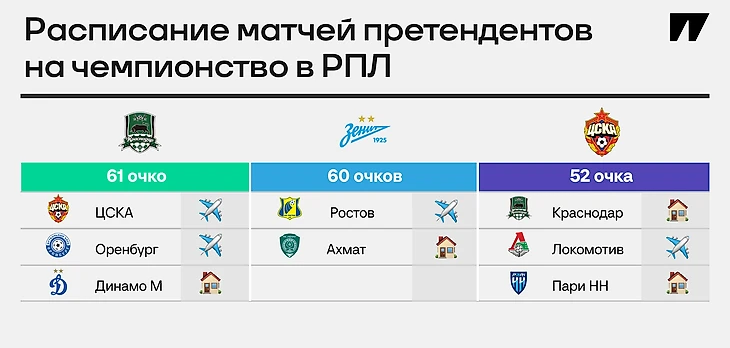 Чемпион определится в 29-м туре, если «Краснодар» с ЦСКА и «Оренбургом» наберет на три очка больше, чем «Зенит» – против «Ростова».