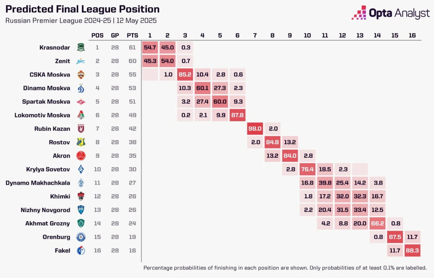 Суперкомпьютер Opta привычно высчитал итоги сезона: прямой вылет – «Оренбург», в стыках останется «Ахмат» и кто-то из пары «Пари НН»/«Химки» – там примерно равные шансы. Стыки «Динамо» компьютер оценивает всего в 14%.