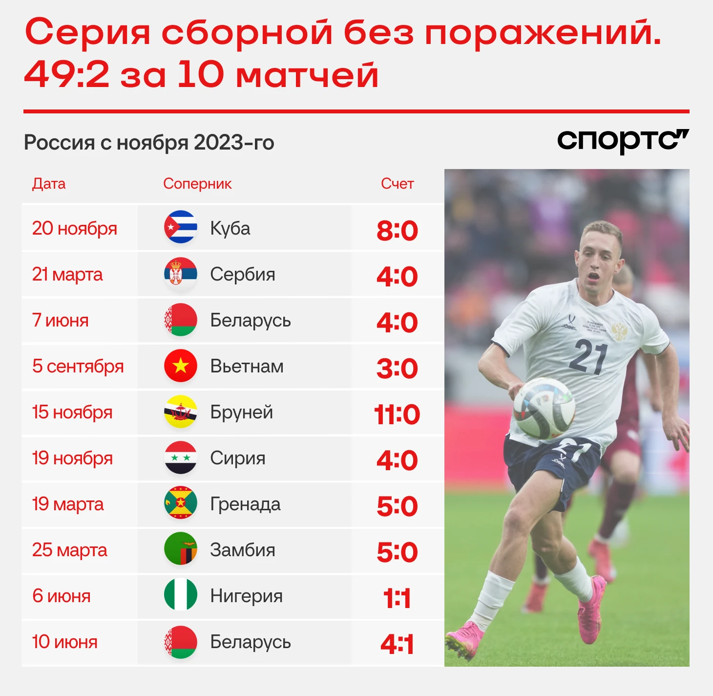 Россия не проигрывает 13 официальных матчей подряд, разница мячей – 53:5.