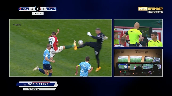 ⏱ 90:36 – главный судья Сергей Карасев идет к монитору, чтобы рассмотреть потенциальный фол Комличенко на Сергее Песьякове перед голом.