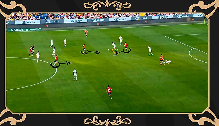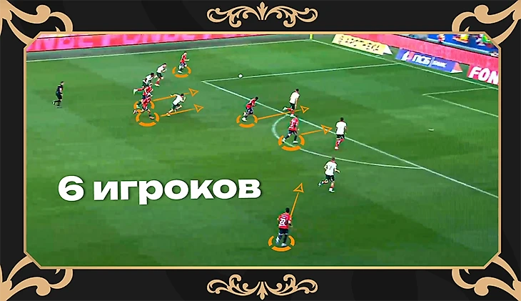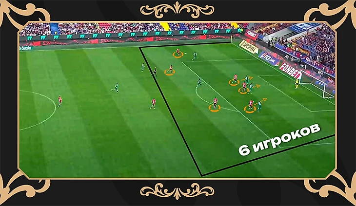 Еще слайд – матч с «Краснодаром», семь игроков в полуфланге (перегруз) и два игрока во фланге. Круговой и Гайч в ширине и создадут опцию: они здесь потеряют мяч, зато хорошо реагируют на потерю.