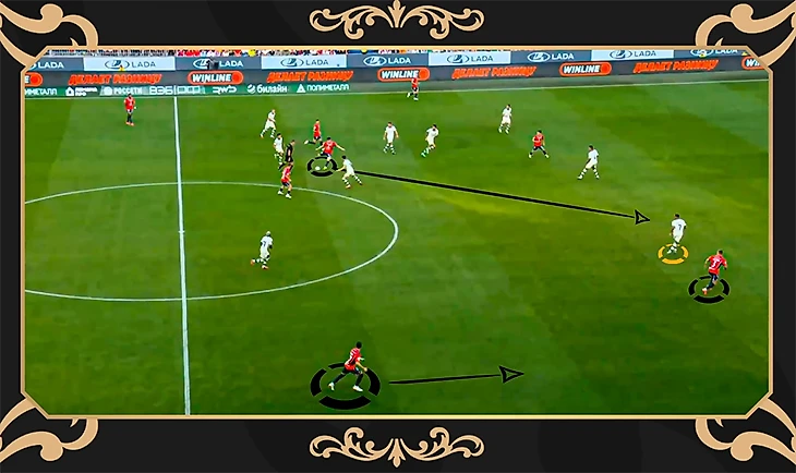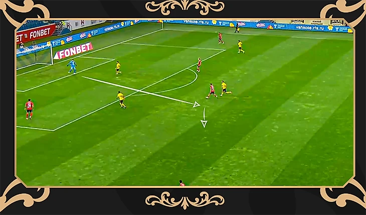 Мы видим, где сейчас Матвей находится: условно играет шестерку, между линиями. У игрока с мячом есть вариант слева и справа. Проникающая или диагональная передачи. Он выбирает и играет через Матвея, тот дальше играет на третьего. Они забивают.