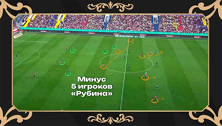 Следующий эпизод – матч с «Рубином». Оранжевыми стрелками – взаимодействие. Акинфеев сыграл налево центральному, потом на Кисляка, и дальше они отрезали проникающей передачей группу игроков «Рубина» и забили.