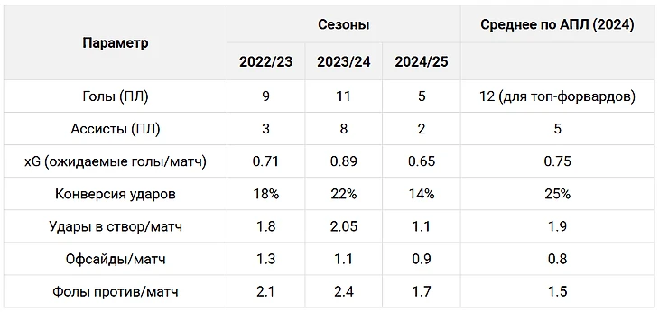 По данным: FBref (перцентили среди форвардов АПЛ 2024/25).