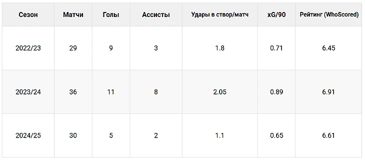 Самым сильным сезоном оказался 2023/24, в нем он больше всего провел времени на поле, выдал лучшую статистику по гол + пас, чаще бил и имел самый высокий xG на 90 минут.