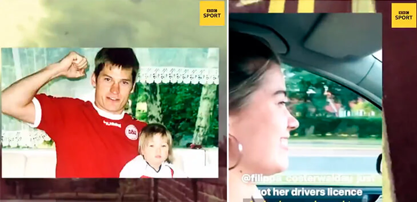 Костер-Вальдау показывает себя 16-летней давности со старшей дочкой Филиппой на руках (сам – в футболке сборной Дании, Николай – датчанин), а следом – свою дочь сейчас за рулем автомобиля.