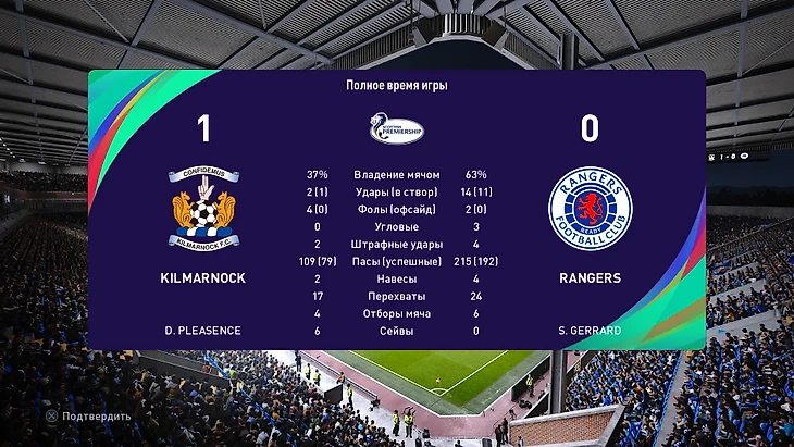 В домашней встрече с «Рейнджерс» хозяева с первых минут матча припарковали «автобус» в собственной штрафной. Расчёт в матче был на возможные контратаки, но в первом тайме гости полностью доминировали. Несколько раз «Килмарнок» выручил вратарь Роджерс, блистательные спасения вратаря «Килли» не позволили игрокам «Рейнджерс» открыть счёт! После перерыва у хозяев наконец стала получаться игра на контратаках. В середине 2-го тайма, вышедший на замену Брофи смог реализовать выход один на один с вратарём. Оставшиеся двадцать минут виртуального времени футболисты «Рейнджерс» обрушили шквал атак на ворота хозяев поля, но забить ответный мяч так и не смогли. Не везёт игрокам из Глазго уже в который раз!