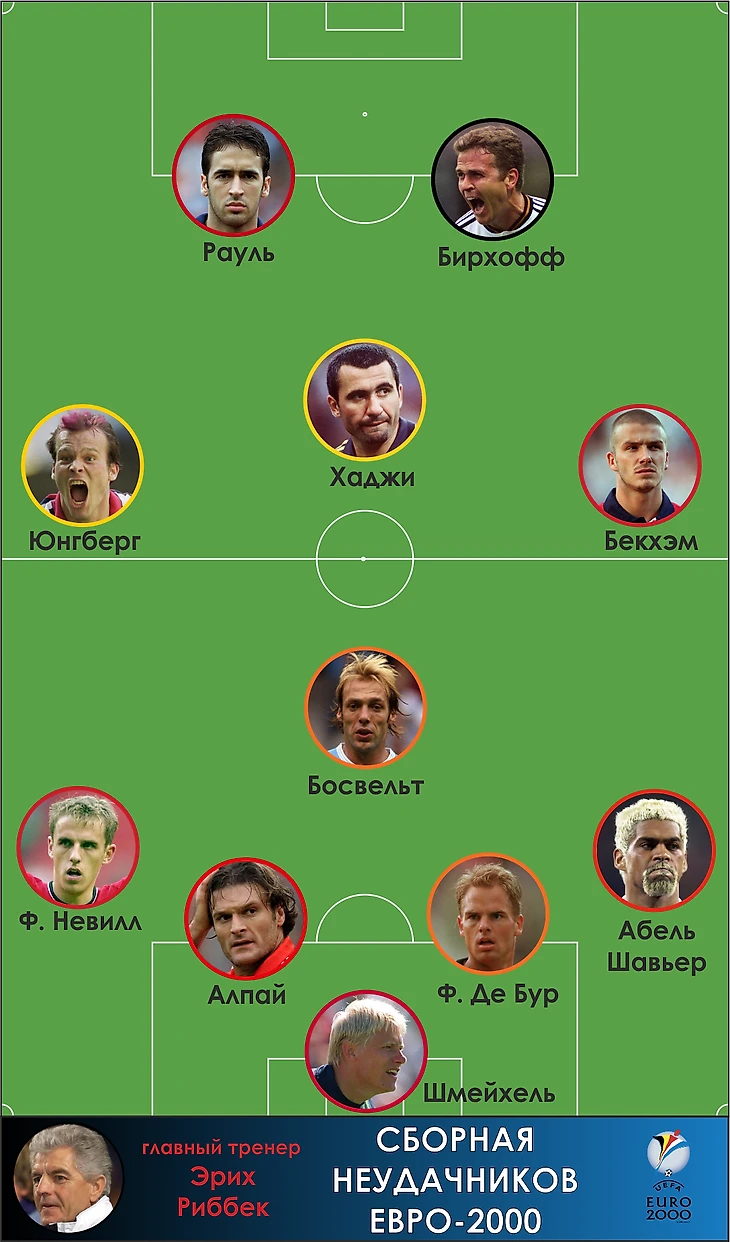 Один из лидеров «МЮ» и сборной Англии, от него, как и от всей сборной, на Евро ожидали многого. Однако англичане показали слабую игру и не вышли даже из группы. Да, Бекхэм не был самым плохим игроком Англии на Евро, отдал три голевых паса, но при этом не оправдал возложенные на него ожидания, впрочем, как и многие другие английские игроки, например, Ширер и Оуэн.