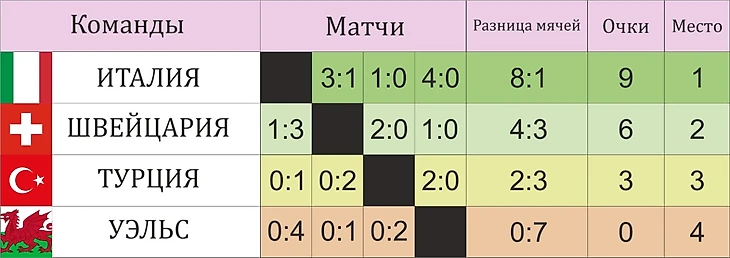 В группе А встретились следующие сборные: Италия (7 место в рейтинге ФИФА), Швейцария (13 место), Уэльс (17 место), Турция (29 место).