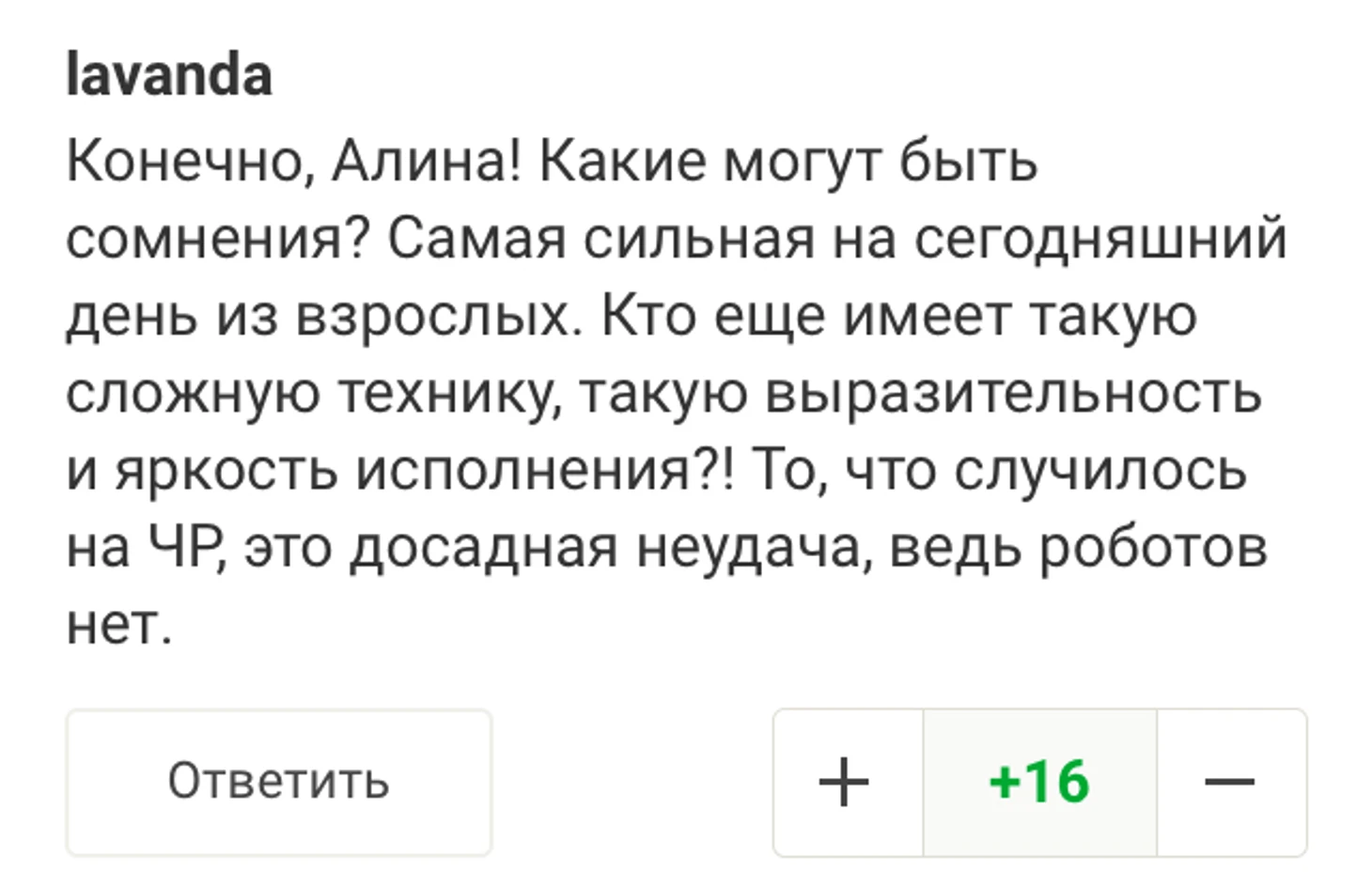 В комментариях пользователи тоже поддержали россиянку. Алина – главный претендент на победу на чемпионате в Минске.
