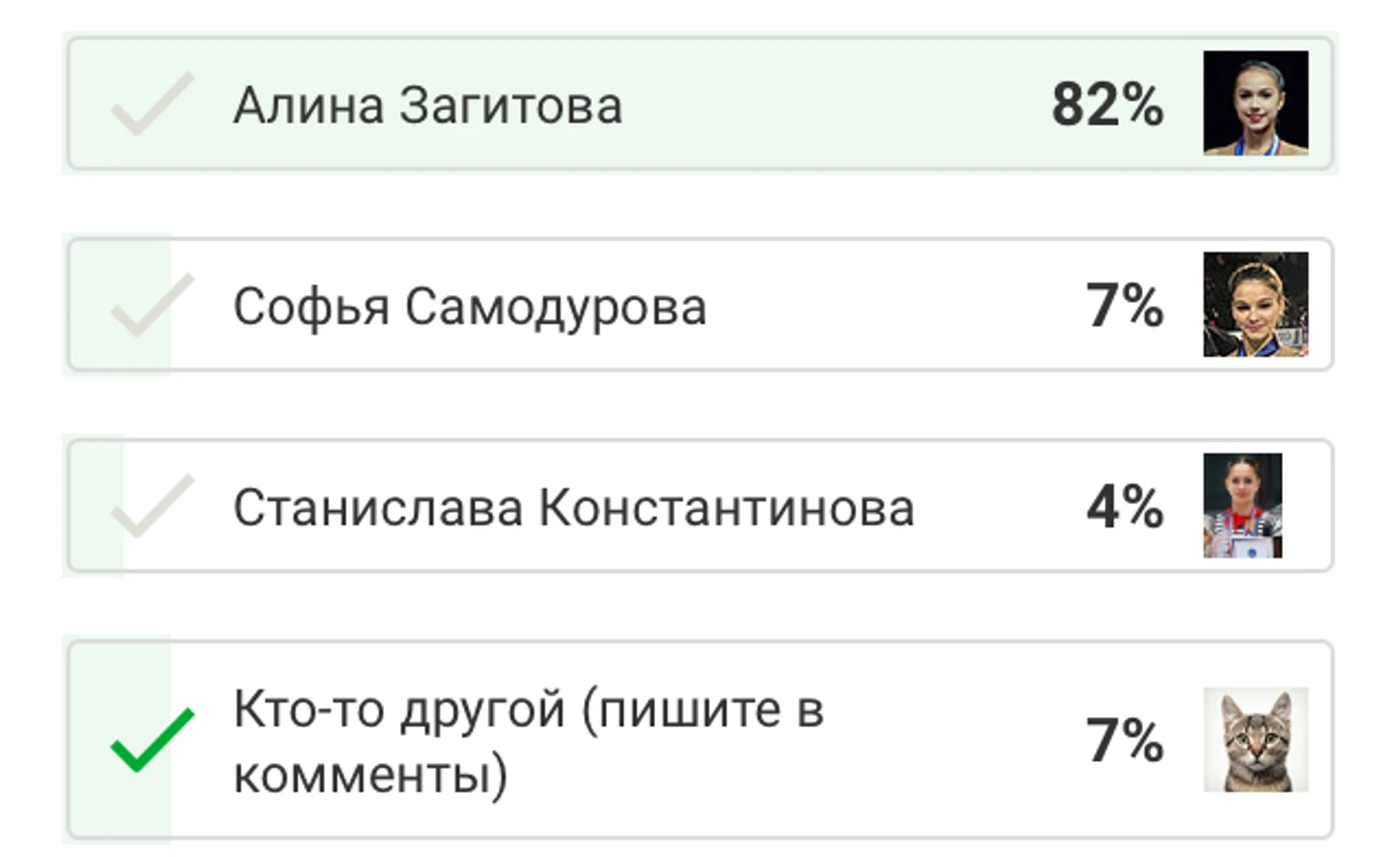 21 января в Минске начнется чемпионат Европы по фигурному катанию. Кто фаворит женского турнира? В опросе пользователей Трибуны выиграла Загитова – 82% голосов за Алину. Невероятный отрыв от остальных.