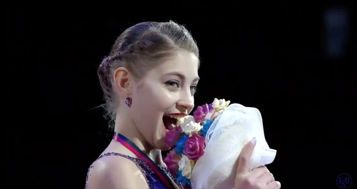 Миниатюрная Анна Щербакова, которая выиграла сегодня произвольную программу, уже на медальной церемонии... чуть не упала. Эпизод на видео Первого канала смотрите с 2:10.
