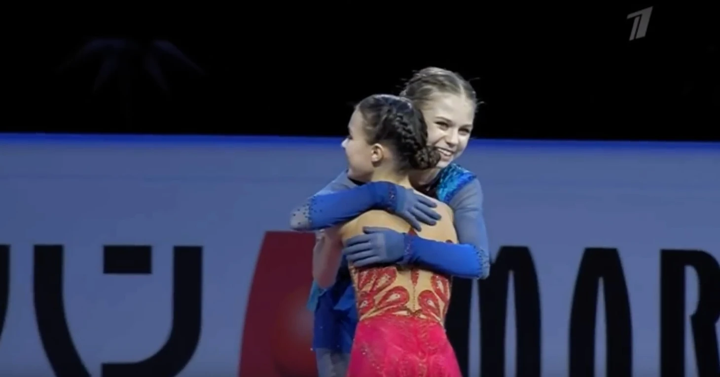Фигуристка запнулась коньками об ковер и угодила в объятия Александры Трусовой. Аня и Саша только рассмеялись: