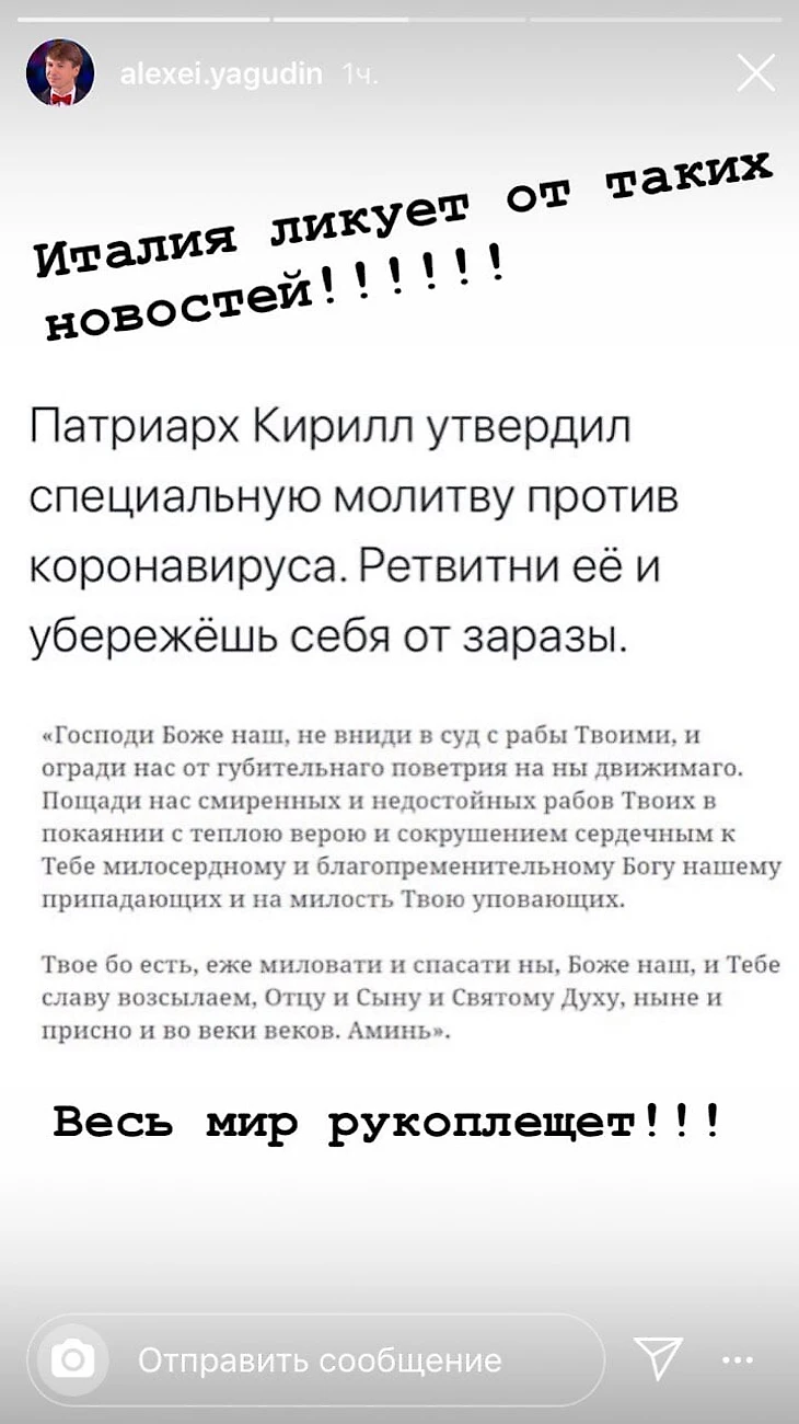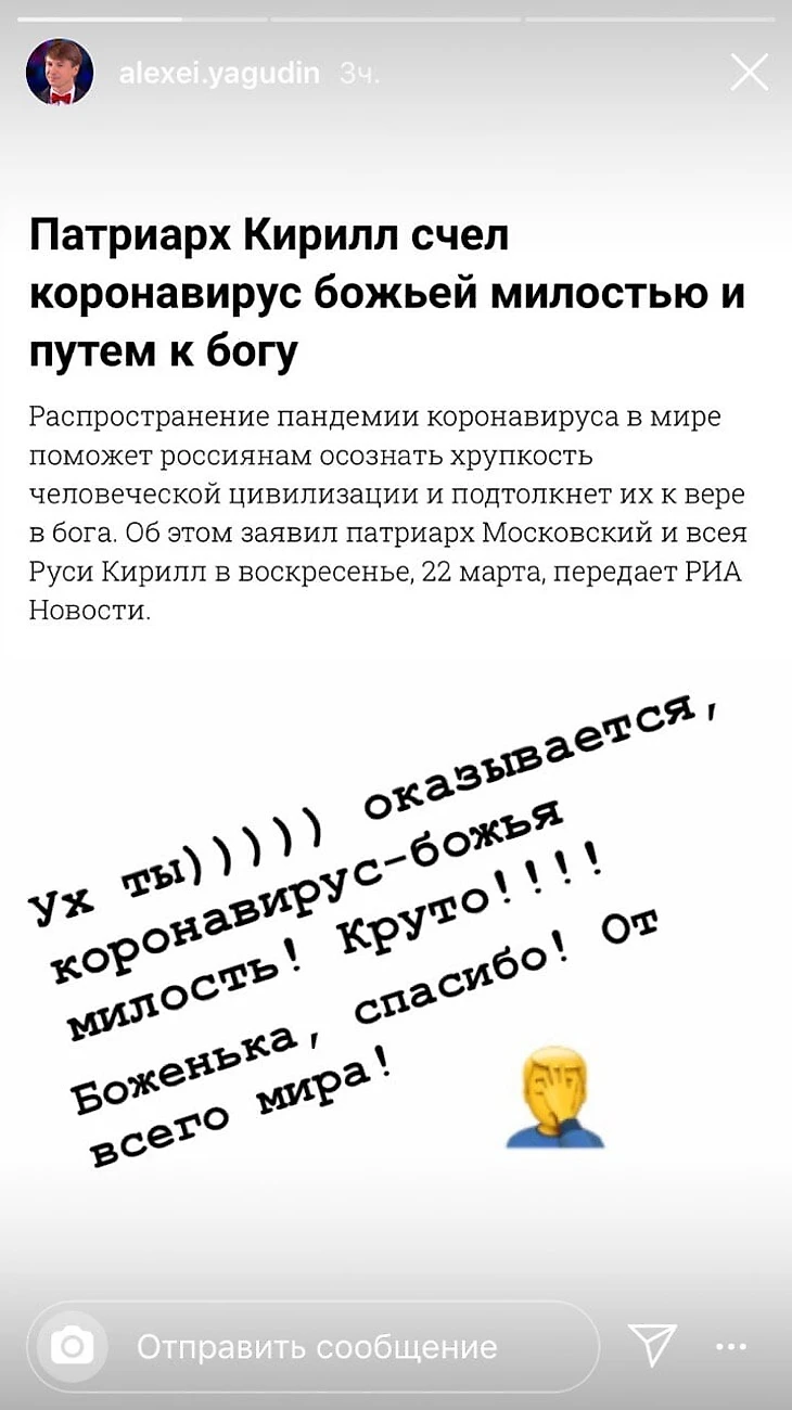Ягудин вникает в коронавирус: 10 дней назад называл его чушью, теперь иронизирует над Патриархом и специальной молитвой